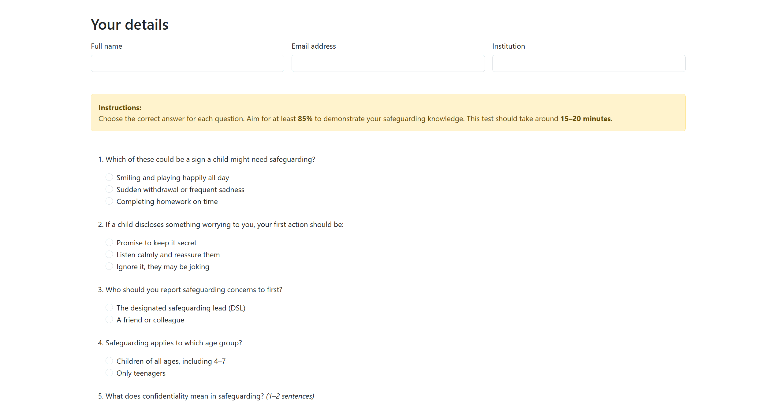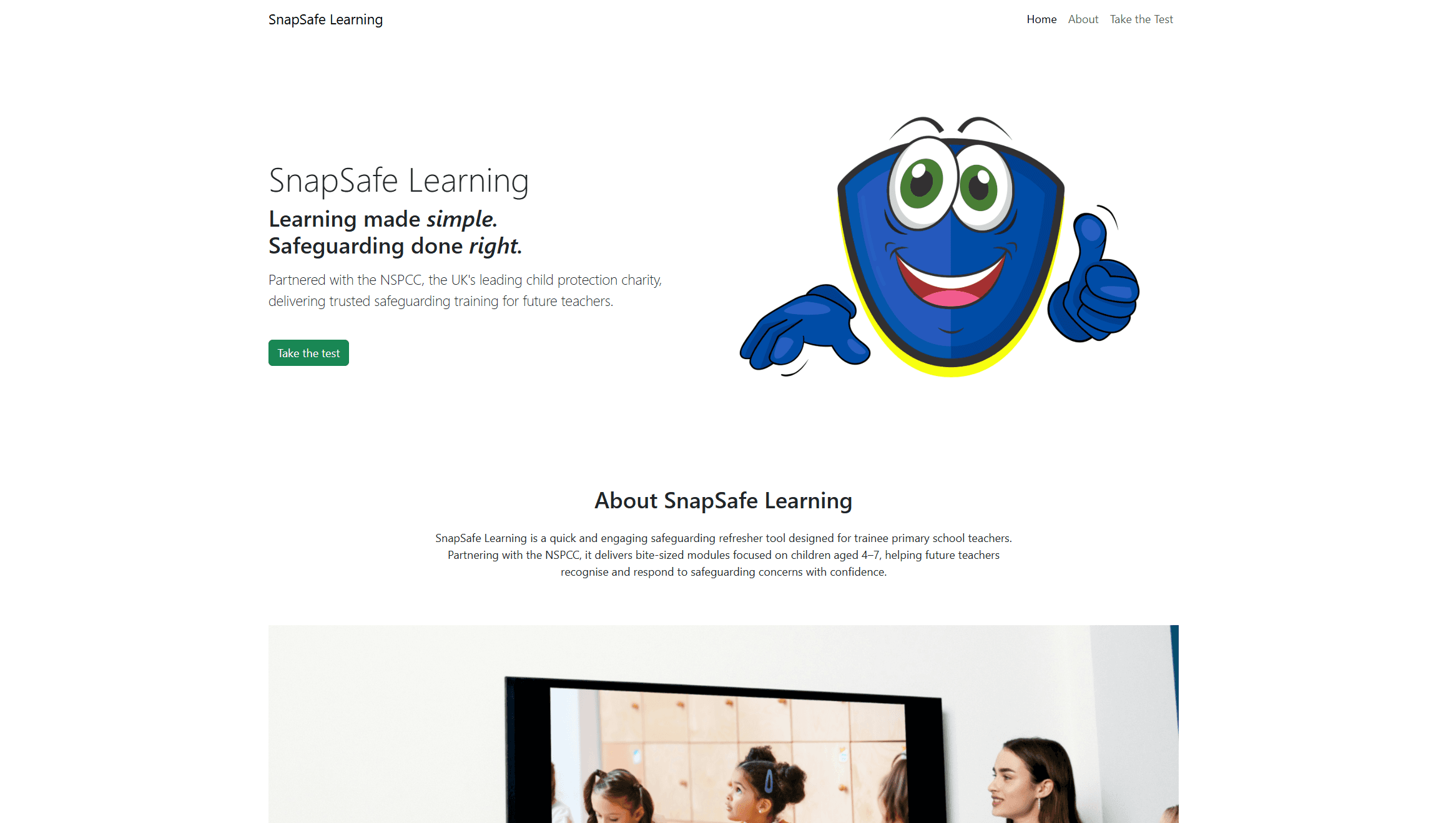 The website was designed with trainee teachers in mind, ensuring that safeguarding information is quick, clear, and easy to engage with. The structure is modular, allowing users to read short “snapshot” sections before completing a test to reinforce their learning. The goal is to act as a refresher tool that can be delivered during teacher training days.